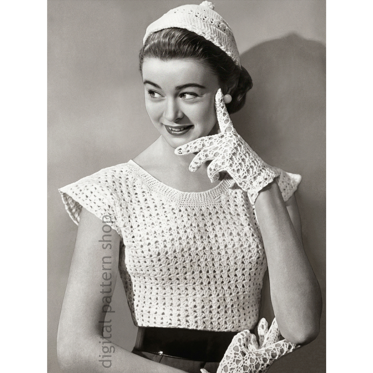 1940s Vintage Jumper Top, Cap and Gloves Crochet Pattern: This very charming set is simple to crochet in cotton, a jumper, a cap, and lacy gloves. Make it in white for Spring to wear with a grey or navy suit, or in your favourite color to wear the rest of the year.