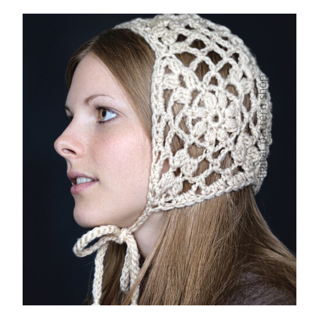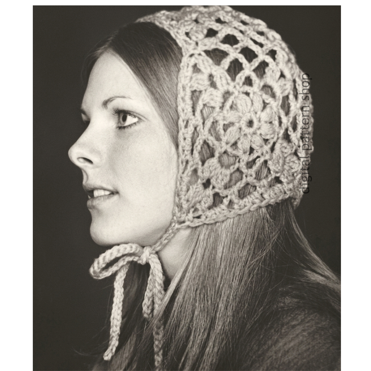 1970s Vintage Flower Motif Cap Crochet Pattern: A pretty lacy flower motif cap, hugs the head. Made of four motifs joined together. It ties at the neckline as a bonnet style helmet hat.