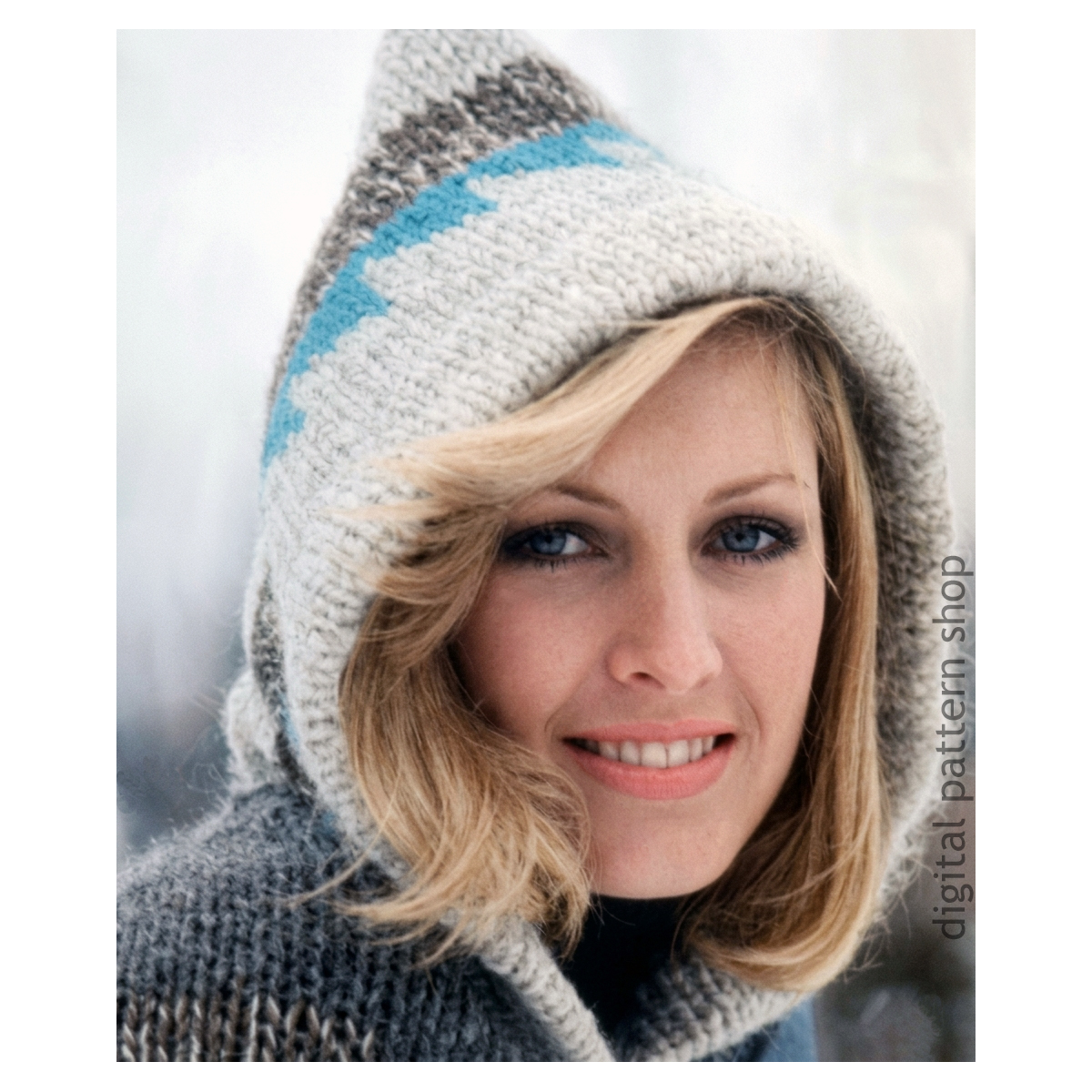 70s Hooded Poncho Knitting Pattern, Diamond Shaped Cape PDF