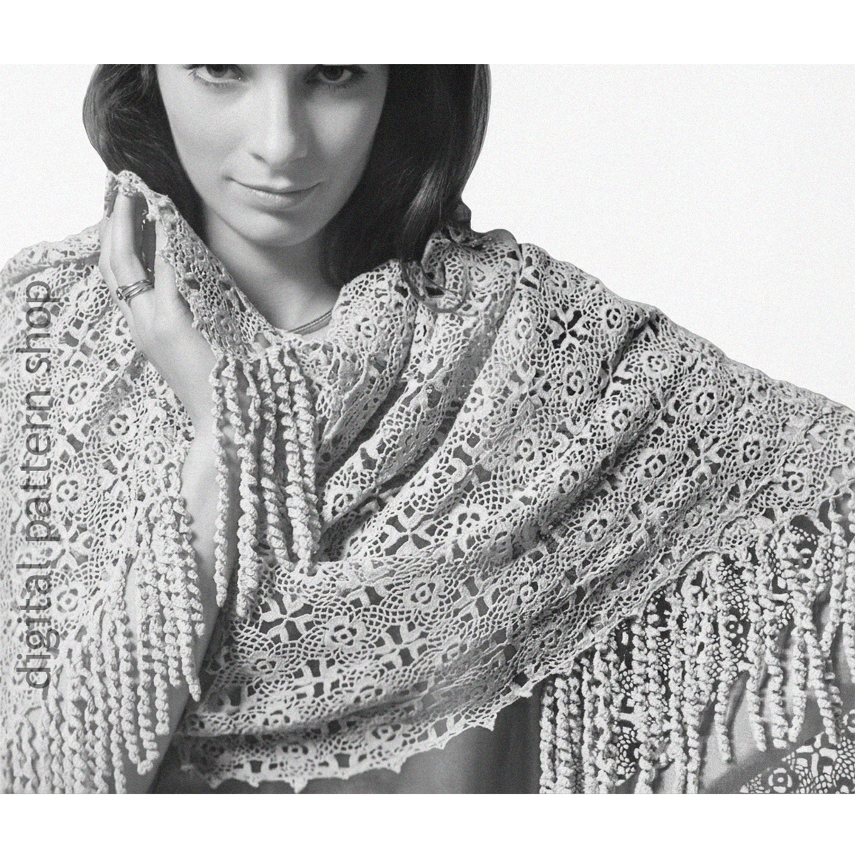 1970s Vintage Lacy Stole Crochet Pattern: Lace wrap shawl made of two styles of motifs is edged in picot stitch and trimmed at the ends with curled fringe.