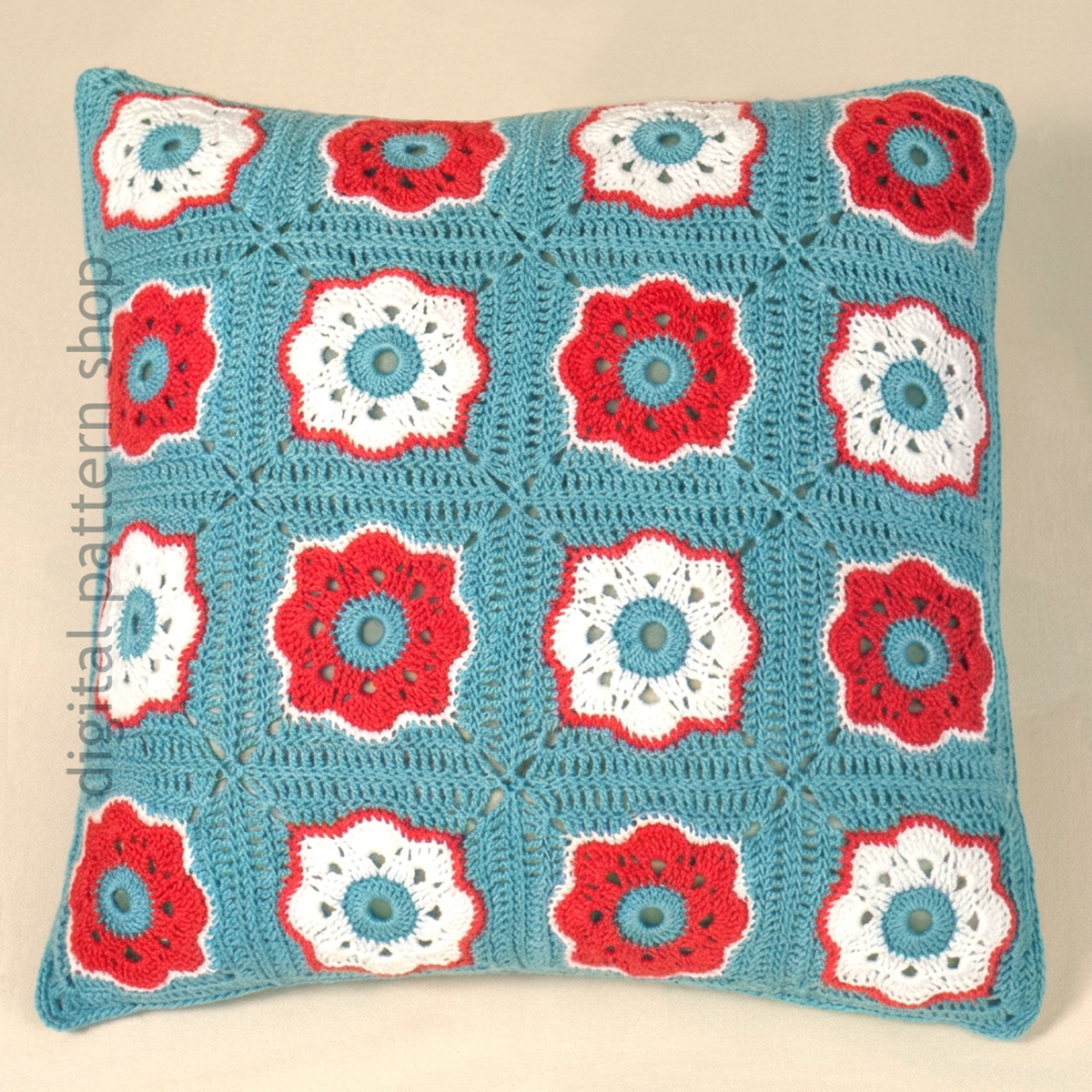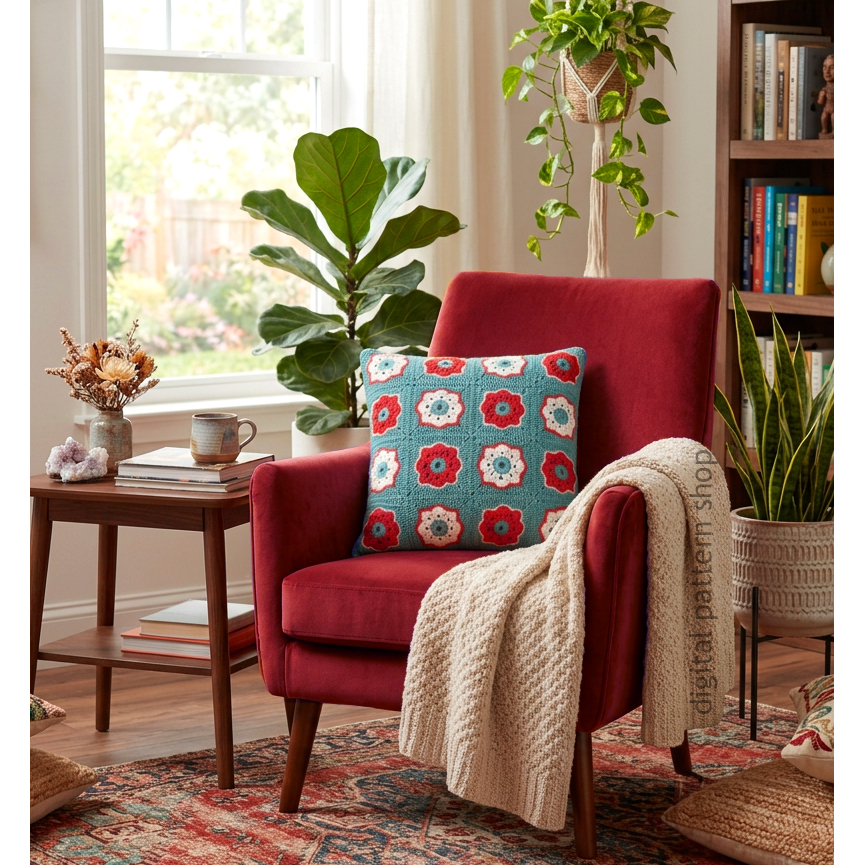 70s Motif Pillow Crochet Pattern, Granny Square Cushion Cover