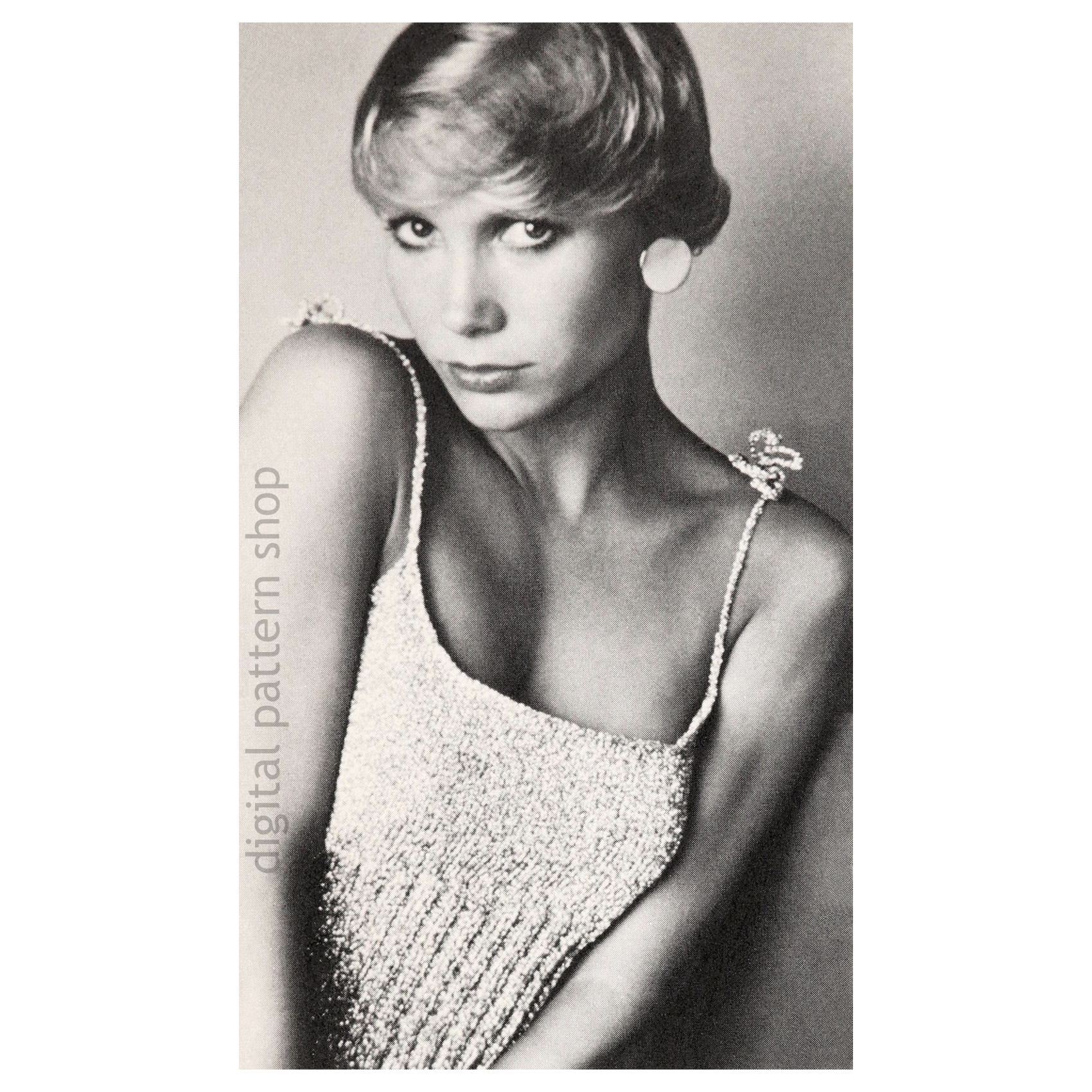 1970s Vintage Cami Evening Top Knitting Pattern: This silver evening top has a ribbed midriff and crocheted spaghetti straps.