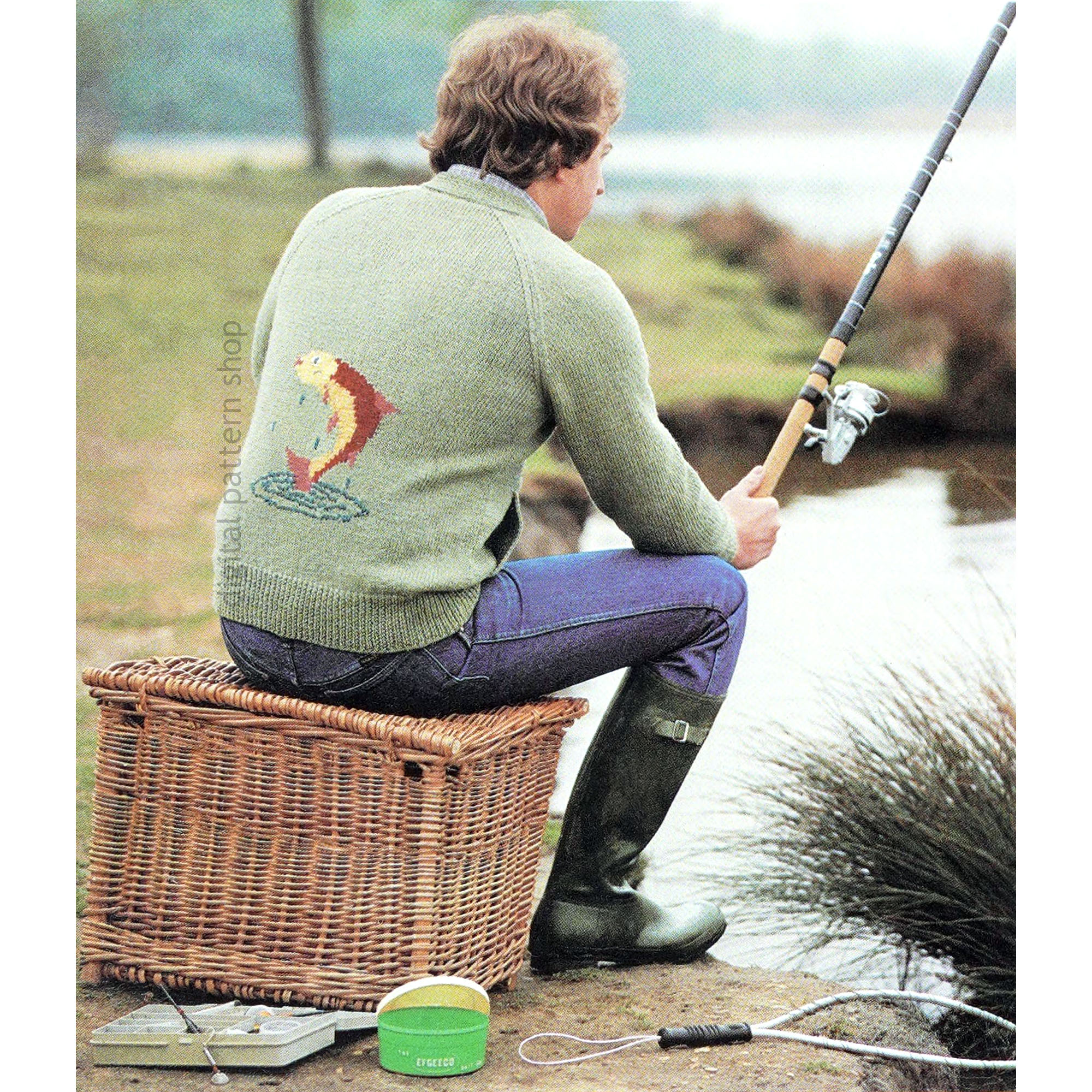 1980s Vintage Men’s Fisherman Cardigan Knitting Pattern: A classic, raglan sleeve cardigan with a fish on the back, knit using chart. It has pockets in the front.